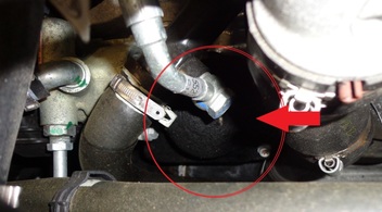 Rechts vom (per Filzhut abgedeckten) Ölfilter ist der dicke Turboschlauch und genau über dem Ölfilter der Kühlwasserschlauch. Dabei ist direkt über dem Ölfilter auch noch ein sperriges T-Stück des Kühlwasserschlauches.
