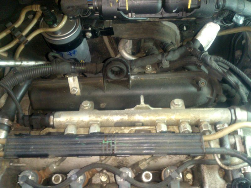 Ein Kabel parallel zum Ölmessstab und der Stecker rechts neben der ECU bleibt dran (weil 's nicht abgeht). Dann oberhalb vom EGR ist der Lufteinlass für den Ansaugkruemmer angeschraubt.