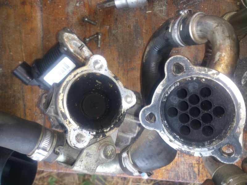 Jetzt die 2 langen Torxschrauben lösen, die das EGR am Motorblock festhalten. Da das AGR mit Kühler ist, muss ich auch die Kühlung abklemmen. Damit man nicht die Kühlflüssigkeit komplett ablassen muss, kann man die Heizung im Auto auf kalt stellen, dadurch wird das Ventil geschlossen. Dann den rueckgehenden Heizungsschlauch quetschen und den Schlauch zum AGR vom Thermostat abziehen und schnell mit z.B. 'ner kleinen Zip-Tüte und einem Haargummi das auslaufende Rohr vom Thermostat verschließen.