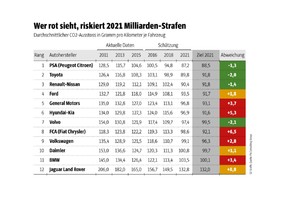 Was es bedeutet, den Modellmix zu ändern, zeigt das Beispiel Fiat Chrysler. Die Italiener schienen auf einem guten Weg zur Zielerreichung zu sein. Vor allem durch die Übernahme größerer Jeep-Fahrzeuge mit altertümlicher Motortechnik in ihr Portfolio ist der Konzern weit zurück gefallen. Als einziger Hersteller verzeichnet er einen Anstieg der CO₂-Emissionen und liegt aktuell 10 Gramm über den ähnlich positionierten Marken Renault-Nissan.