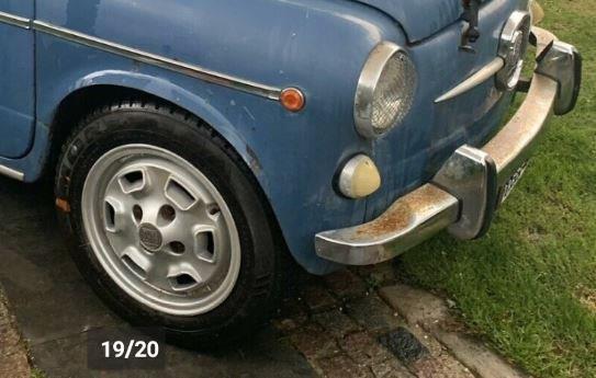 Der Wagen ist Zuhause. Es hat sich rausgestellt, dass es ein Fiat 600D ist, der nur optisch an den Abarth angelehnt ist. Er hat den 750er Motor und das Typenschild am Heck ist Zubehör. Die Felgen stammen vom Fiat 127 und sind 13 Zöller Alufelgen.
