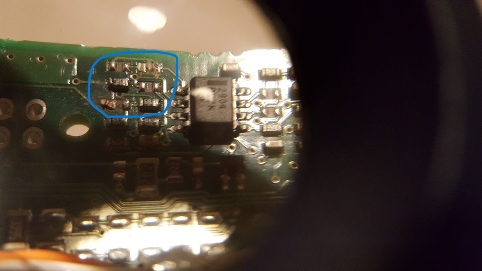 Alles wieder ausgebaut und die Platine mit der Lupe abgesucht. Zwei defekte Bauteile gefunden.