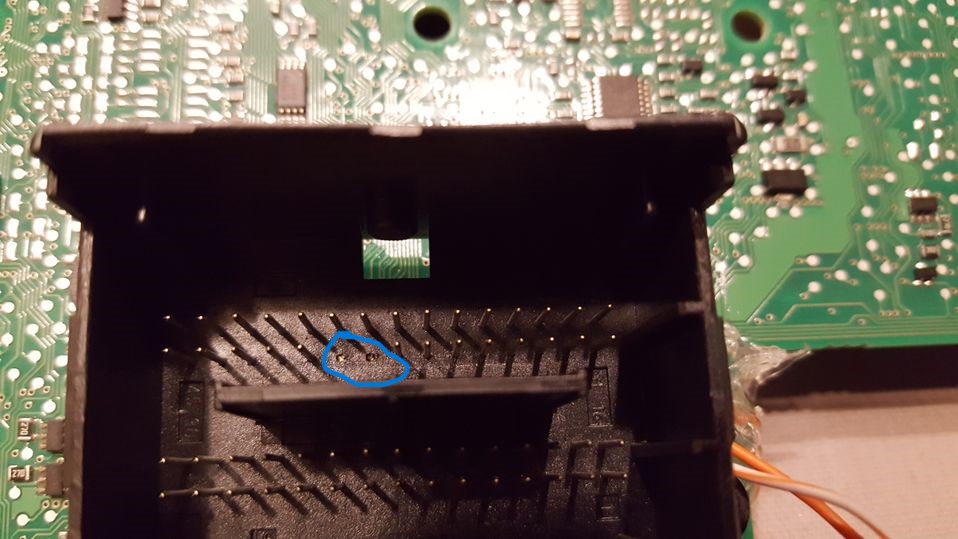 Bodycomputer geöffnet. Der Abgebrochene Pin, Nr. 40 ist nicht belegt. Der abgebrannten Pin, Nr. 39 ist belegt.