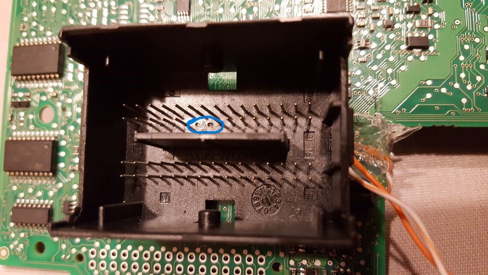 Bodycomputer geöffnet. Der Abgebrochene Pin, Nr. 40 ist nicht belegt. Der abgebrannten Pin, Nr. 39 ist belegt.