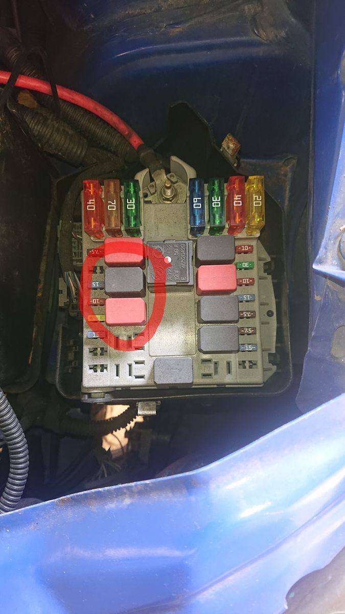 Hier mal ein Bild vom Sicherungskasten im Motorraum, die markierten Relais kacken durchgehend sobald die Zündung aktiviert ist. Wofür sind diese und könnte hier der Fehler liegen?