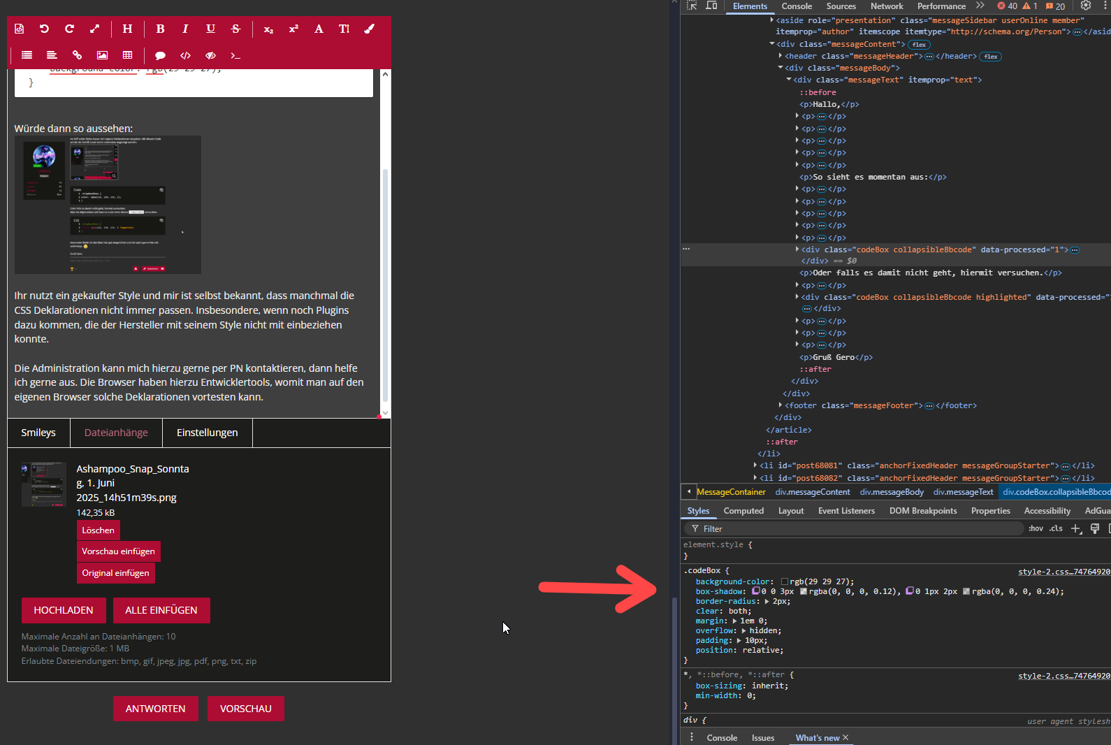 • Mit der Codebox kann man aber auch einfach den Hintergrund mit der Farbe wechseln und dann passt es auch wieder. Finde ich sogar besser, als die Textfarbe zu ändern.