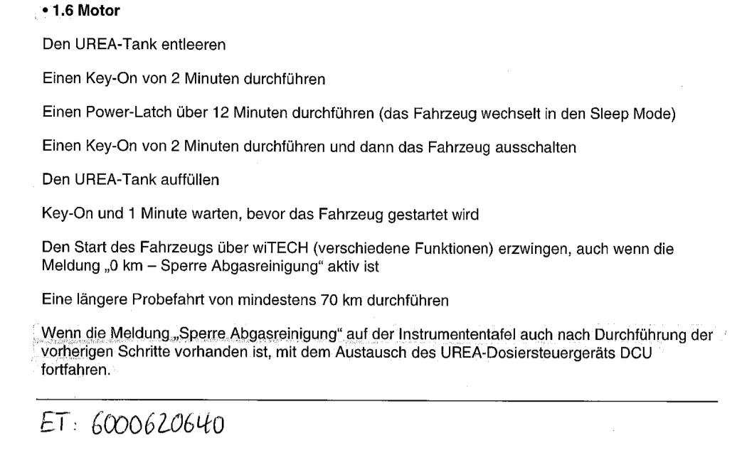 vielleicht kann mich hier jemand bzgl. der AdBlue Technik erhellen. Wir haben gerade unseren Fiat Talento wegen der angekündigten AdBlue Sperre rechtzeitig in der Werkstatt. Dort wurde ein Reparaturprotokoll abgearbeitet, siehe Foto. Dort haben die Schritte nichts gebracht und sie wollen das AdBlue Steuergerät tauschen (Angebot: 1100€) Das war mir zu heftig, da vorher schon die beiden NOx Sensoren getauscht wurden (kurz danach kam die AdBlue Warnleuchte). Also bin ich auf die Suche nach dem Ersatzteil gegangen und bei Metzger fündig geworden. Habe das Teil mit der FIN bei Metzger telefonisch bestätigen lassen (Originalteil, Neuteil). Aktueller Stand, die FIAT Werkstatt kann es nicht programmieren. Gewährleistung für selbst besorgtes Ersatzteil hätte ich abgelehnt.