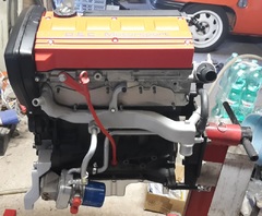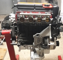 Keilrippenriemen ist montiert und auch die erleichterte Schwungscheibe hat ihren platz eingenommen..... Fehlt nur noch der fächerkrümmer (tut seinen Dienst noch am Serienmotor), Getriebe und die Wasserleitung zum wärmetauscher am Ölfilter fehlt. Diese biege ich wenn der Fächerkrümmer verbaut ist. damit ich sehe, ich ich platzmäßig hinkomme.