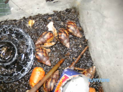 Ich biete hier meine Achatina fulica Nachzuchten von Nov 09 zum Kauf an. Fressen am liebsten Gurke,Kopfsalat,Chinakohl,Möhren und gek. Kartoffeln. Sie sind gewöhnt an sepiaschale und an schnecken Kalk.1 mal in der Woche dusche ich sie warm ab und reibe das Haus mit Öl ein.Die Hauslänge ist zwischen 5-6 cm. kann aber bis zu 25 cm. herranwachsen. Sie wurden von meinem Tierarzt untersucht und es wurde bestätigt das sie Achatina fulica sind. Da ich kein Fan von Tierversand bin nur Abholung!!!!Bei Interesse einfach melden die Schnecken können auch besichtigt werden!In Lünen Brambauer kreis Unna!