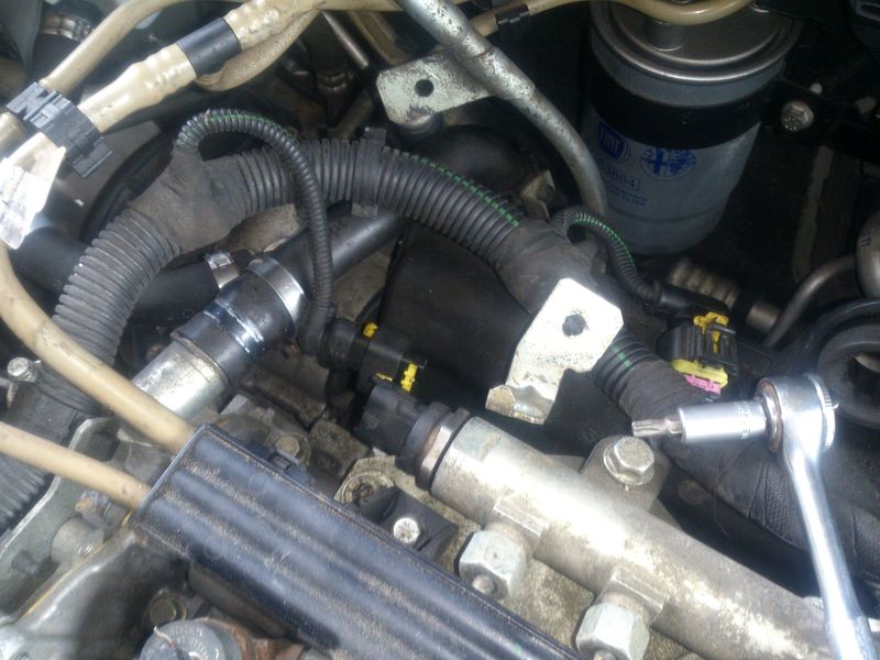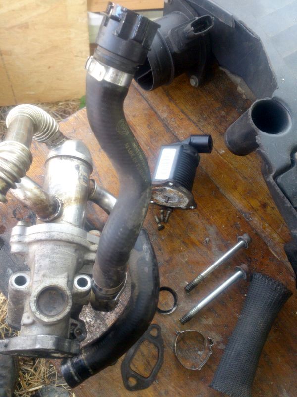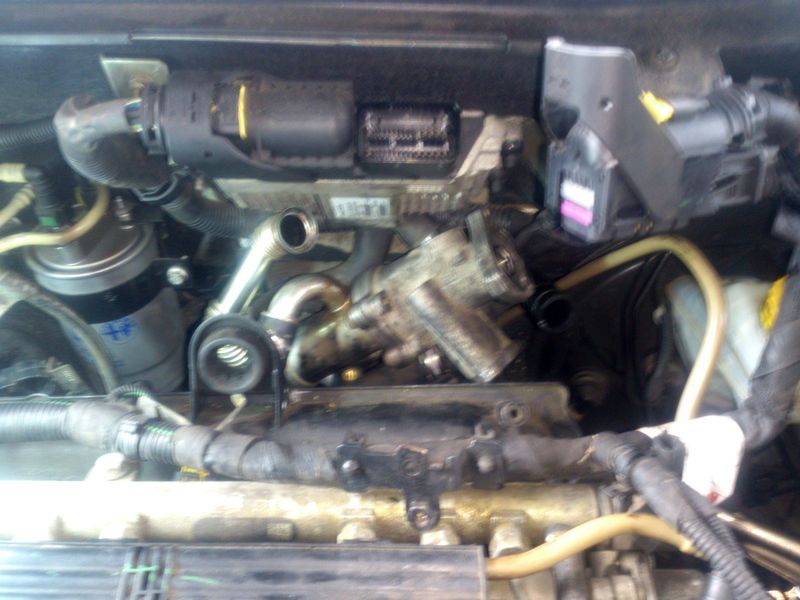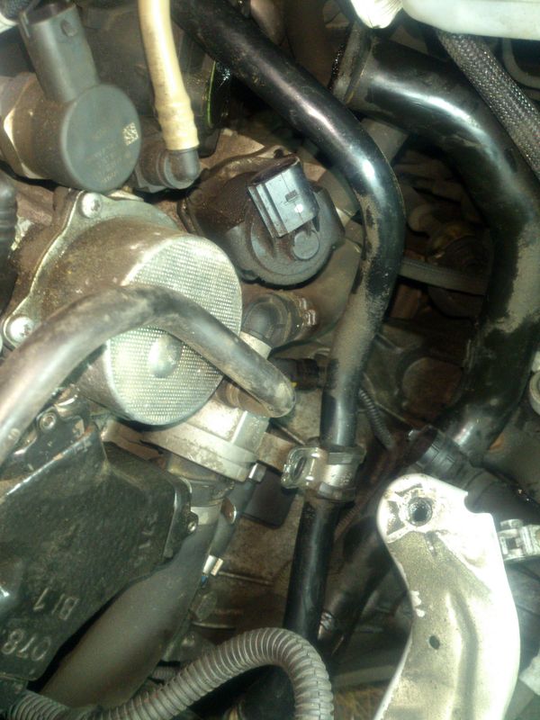 Ein Kabel parallel zum Ölmessstab und der Stecker rechts neben der ECU bleibt dran (weil 's nicht abgeht). Dann oberhalb vom EGR ist der Lufteinlass für den Ansaugkruemmer angeschraubt.