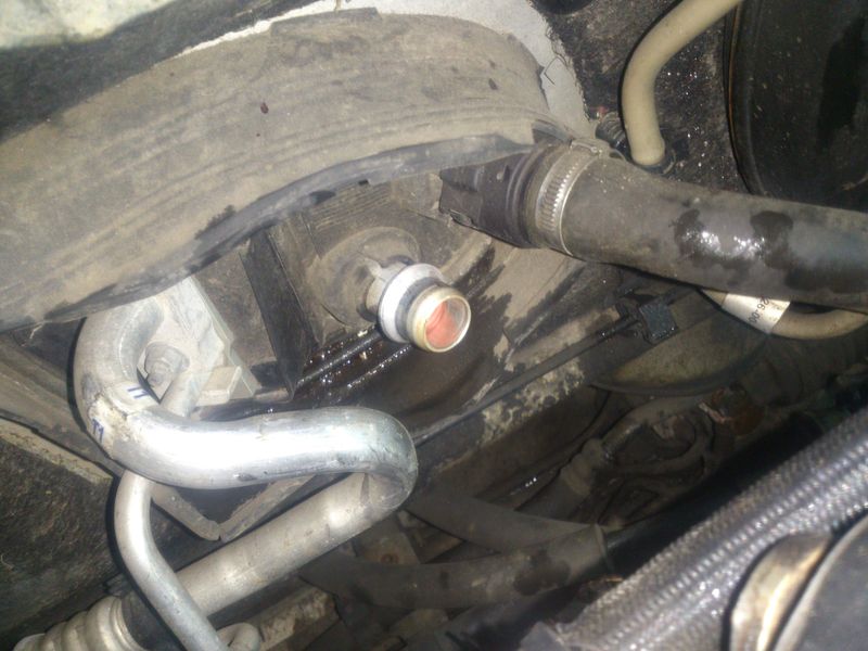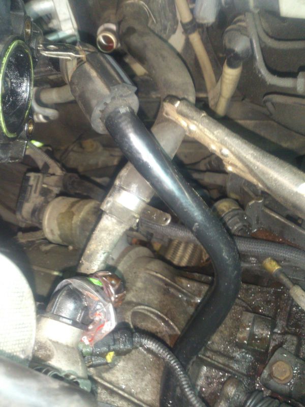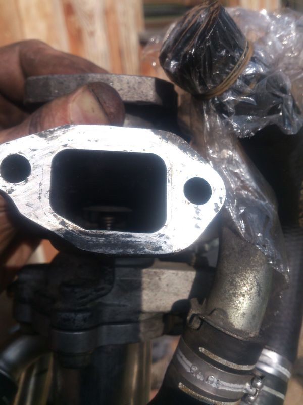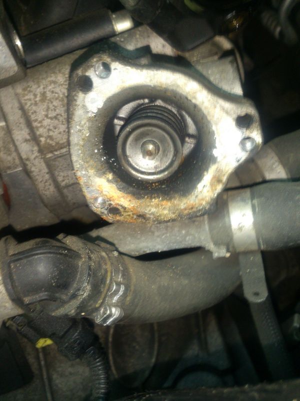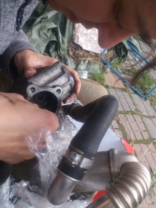 Jetzt die 2 langen Torxschrauben lösen, die das EGR am Motorblock festhalten. Da das AGR mit Kühler ist, muss ich auch die Kühlung abklemmen. Damit man nicht die Kühlflüssigkeit komplett ablassen muss, kann man die Heizung im Auto auf kalt stellen, dadurch wird das Ventil geschlossen. Dann den rueckgehenden Heizungsschlauch quetschen und den Schlauch zum AGR vom Thermostat abziehen und schnell mit z.B. 'ner kleinen Zip-Tüte und einem Haargummi das auslaufende Rohr vom Thermostat verschließen.