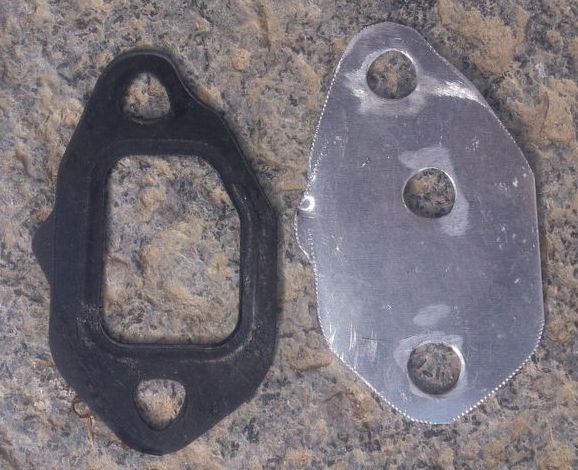 Links im Bild ist die Originaldichtung vom AGR zum Motor. Rechts hab ich ein Alublech geschnitten und gebohrt, um die Verschmutzung der Mechanik zu verringern, weil weniger durchgeht.